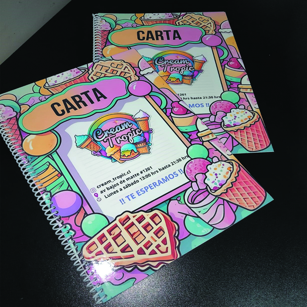 Fabricada por Creaciones Online, bajo la marca CARTA RESTAURANTE, esta carta cuenta con encuadernación espiral que facilita su manipulación y brinda un toque profesional a la presentación de tus platos.
