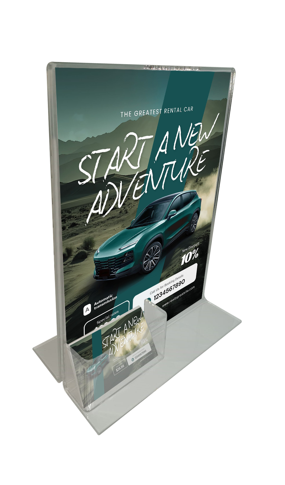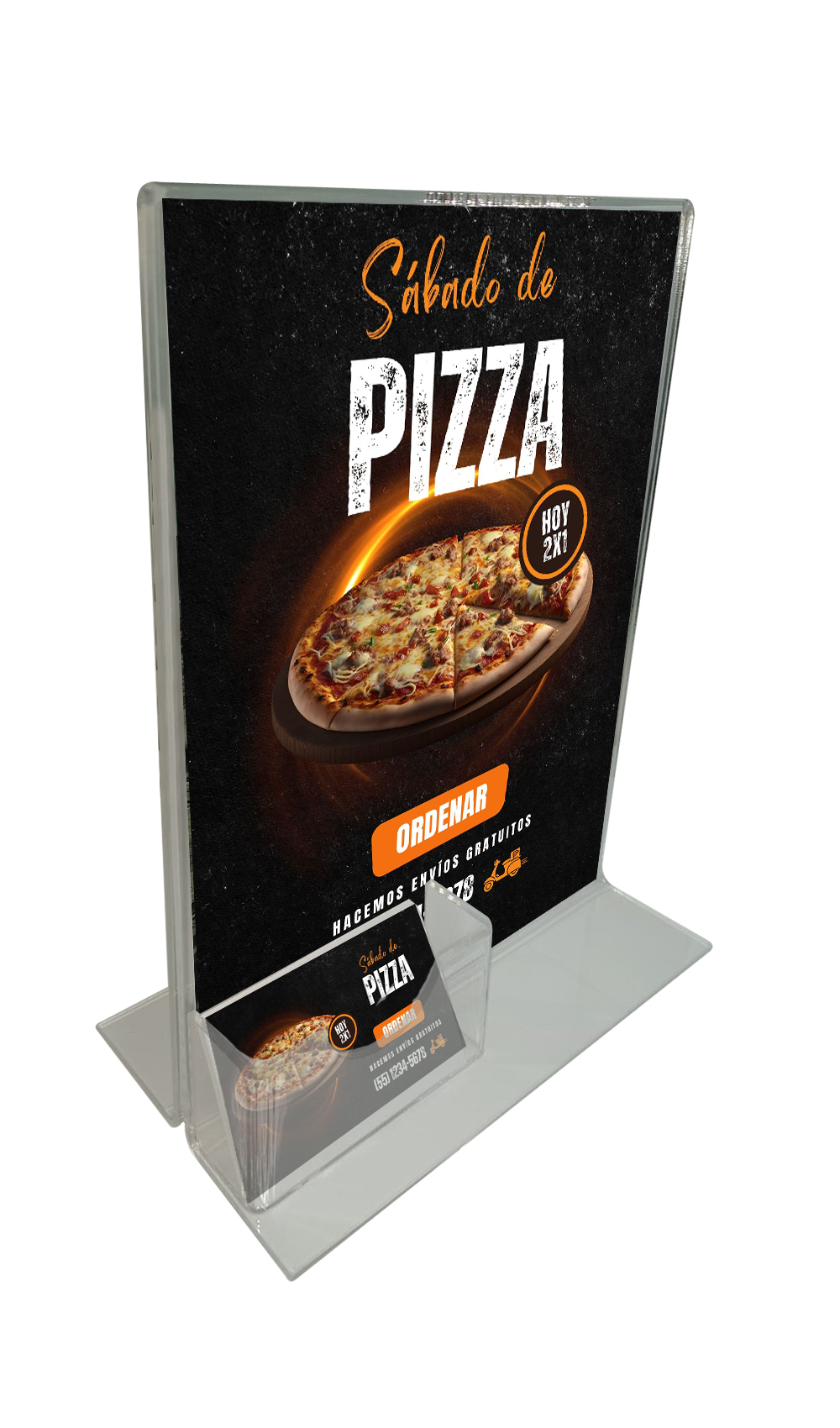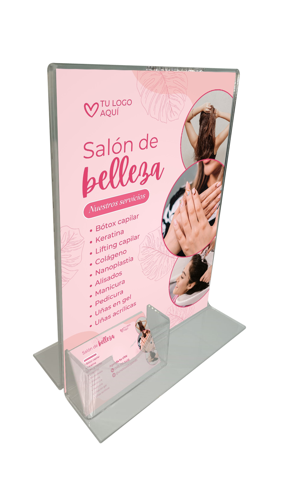 Con unas dimensiones de 29 cm de altura y 21,5 cm de ancho, este porta acrílico personalizado cuenta con un compartimento de 10×5 cm, perfecto para mostrar su tarjeta de visita o cualquier folleto informativo. Su diseño de montaje en mesa asegura que se mantenga firme y visible en cualquier entorno, ya sea en la recepción de su empresa o en eventos.